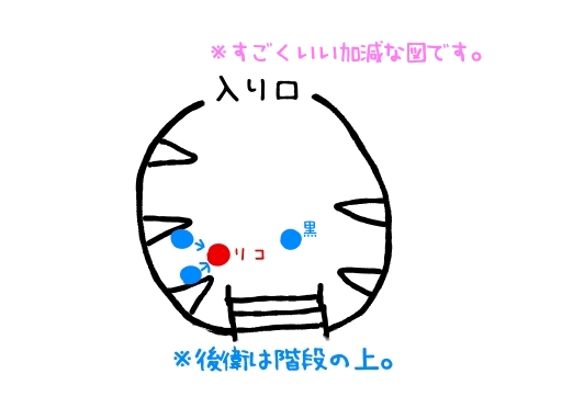 下は最終ターン時の立ち位置です。前衛は1.2回目も同じ場所でやったと思います。黒はホントは他の壁を背にと言われたんですが、階段降りたとこでやっちゃってました。:P